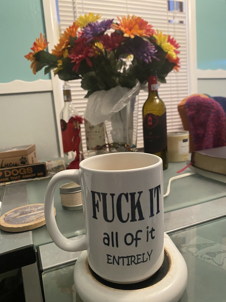 Anyway! Since I’m going nowhere, I grabbed my favorite coffee mug and made a pour over with Hazelnut coffee, two tablespoons of heavy cream and a shot of Buffalo Trace bourbon. Breakfast never tasted so good! If you’ve haven’t tried this, you should. Here’s the obligatory PSA: Always drink responsibly.